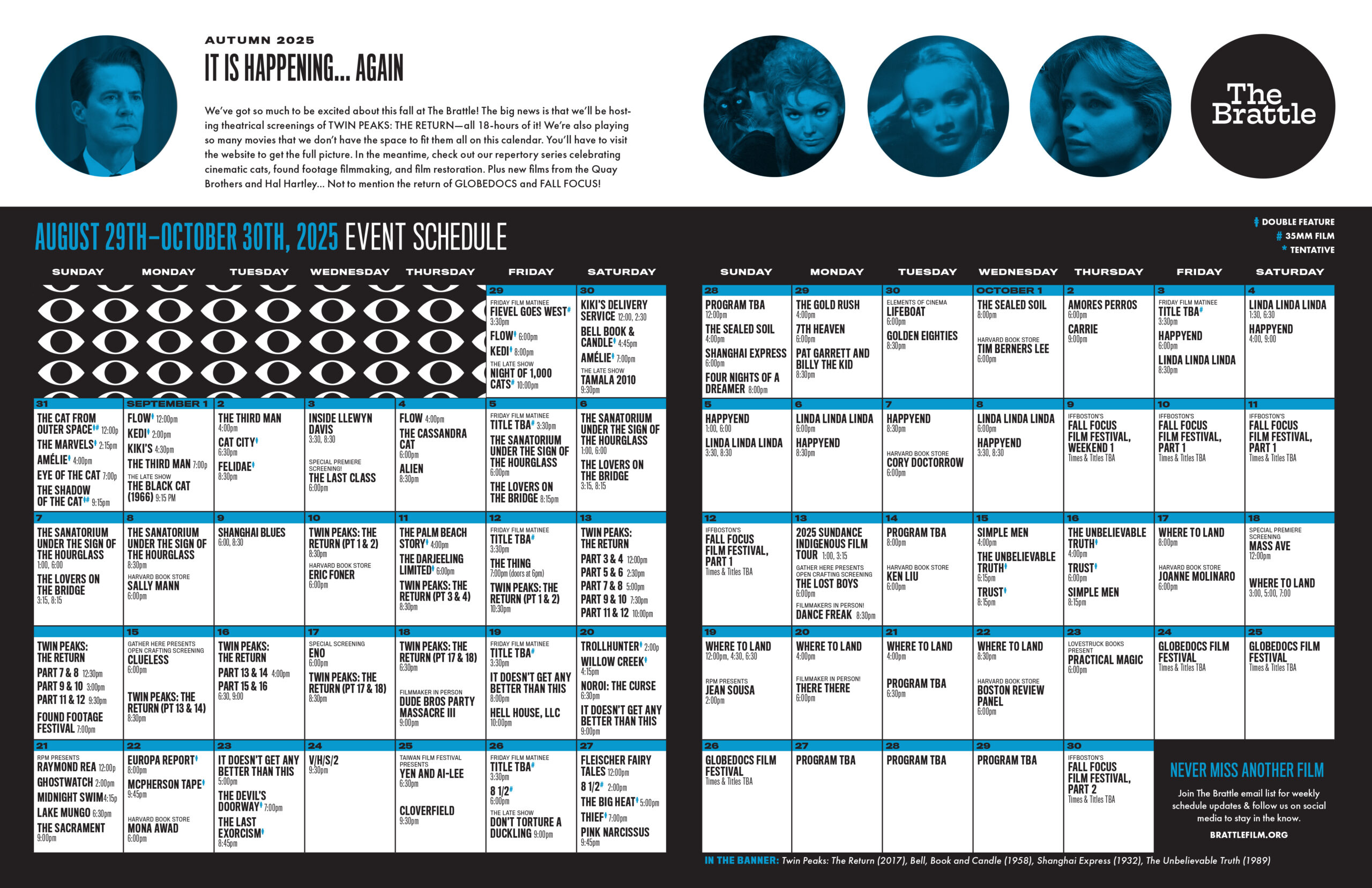 We’ve got so much to be excited about this fall at The Brattle! The big news is that we’ll be hosting theatrical screenings of TWIN PEAKS: THE RETURN—all 18-hours of it! We’re also playing so many movies that we don’t have the space to fit them all on the printed calendar, but we’ll list them all below so you can get the full picture. Check out our repertory series celebrating cinematic cats, found footage filmmaking, and film restoration. Plus new films from the Quay Brothers and Hal Hartley… Not to mention the return of GLOBEDOCS and FALL FOCUS!